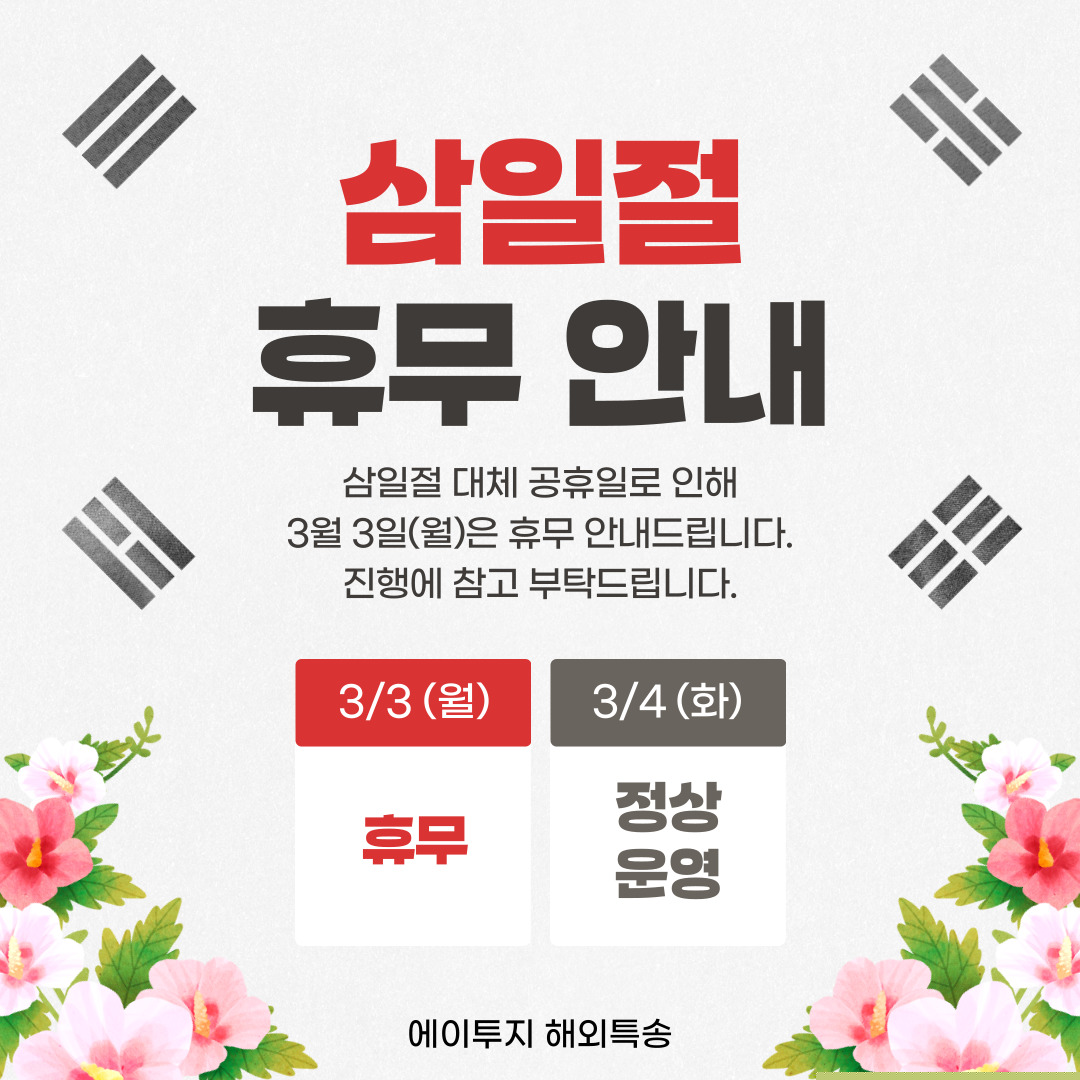 [공휴일 안내] 3/3(월) 삼일절 대체 공휴일 휴무 안내